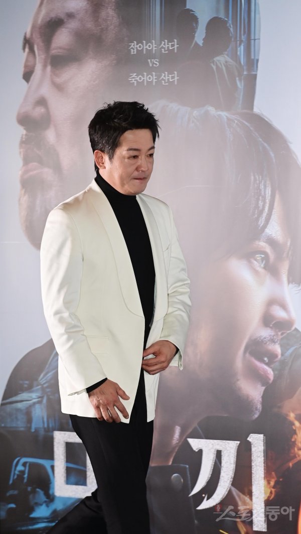 배우 허성태가 25일 서울 강남구 삼성동 메가박스 코엑스점에서 열린 쿠팡플레이 ‘미끼’ 언론시사회 무대에 오르고 있다.