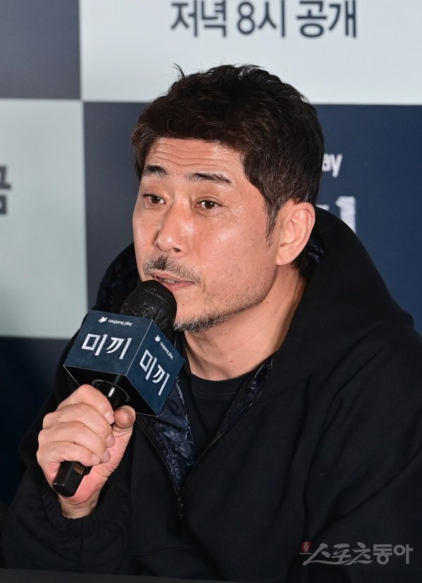 김홍선 감독이 25일 서울 강남구 삼성동 메가박스 코엑스점에서 열린 쿠팡플레이 ‘미끼’ 언론시사회에서 인사말을 하고 있다.