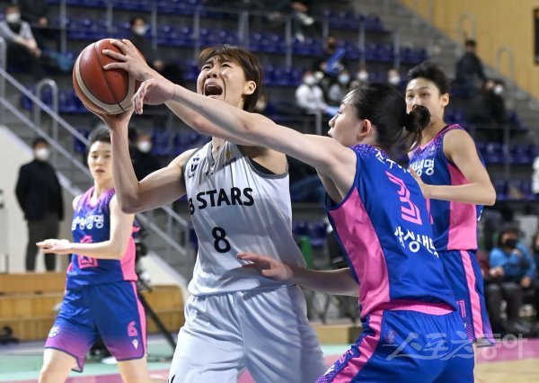 25일 용인체육관에서 열린 ‘신한은행 SOL 2022~2023 여자프로농구’ 삼성생명과 KB스타즈 경기에서 KB스타즈 김민정이 삼성생명의 수비를 뚫고 골밑을 공격하고 있다.