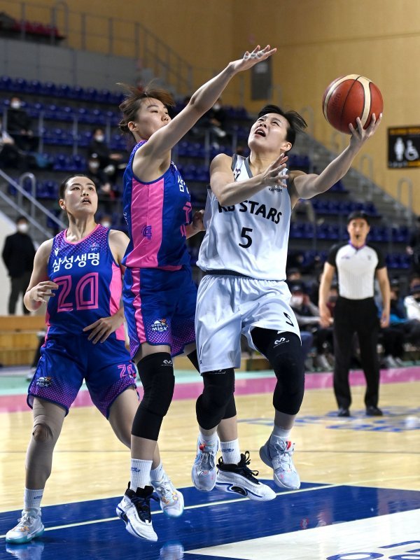 25일 용인체육관에서 열린 ‘신한은행 SOL 2022~2023 여자프로농구’ 삼성생명과 KB스타즈 경기에서 KB스타즈 심성영이 삼성생명의 수비를 뚫고 골밑을 공격하고 있다.