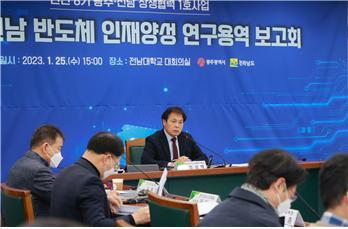 반도체 특화단지 유치를 위해 광주전남 대학과 지자체가 총력을 기울이는 가운데 인재양성을 위한 연구 용역 착수보고회가 지난 25일 전남대 본부 1층 대회의실에서 열렸다.이날 보고회에는 정성택 광주전남 반도체 인재양성위원장(전남대 총장) 주재로 열린 이날 보고회에는 광주광역시, 전라남도, 광주·전남교육청을 비롯해 지역 대학의 반도체 전문가들이 참여했다.