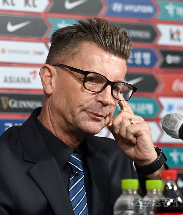 콜린 벨 여자 축구대표팀 감독이 26일 서울 종로구 축구회관에서 열린 신년 기자회견에서 잠시 생갹을 하고 있다.