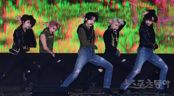 그룹 투모로우바이투게더가 26일 서울 강남구 삼성동 코엑스 오디토리움에서 열린 미니앨범 5집 ‘이름의 장: TEMPTATION’ 발매 기념 프레스 쇼케이스에서 타이틀곡 ‘Sugar Rush Ride‘하고 있다.