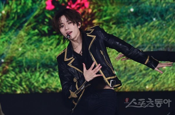 그룹 투모로우바이투게더 범규가 26일 서울 강남구 삼성동 코엑스 오디토리움에서 열린 미니앨범 5집 ‘이름의 장: TEMPTATION’ 발매 기념 프레스 쇼케이스에서 타이틀곡 ‘Sugar Rush Ride‘하고 있다.