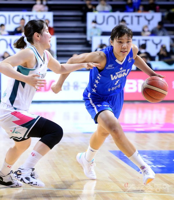 26일 충청남도 아산이순신체육관에서 열린 ‘신한은행 SOL 2022-2023 여자프로농구’ 아산 우리은행과 부천 하나원큐의 경기에서 우리은행 박지현이 하나원큐 수비를 피해 돌파하고 있다.