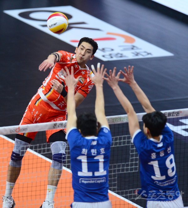 26일 안산 상록수체육관에서 열린 ‘2022~2023 도드람 V-리그’ 남자부 OK금융그룹과 현대캐피탈 경기에서 OK금융그룹 차지환이 현대캐피탈의 블로킹 사이로 스파이크를 날리고 있다.