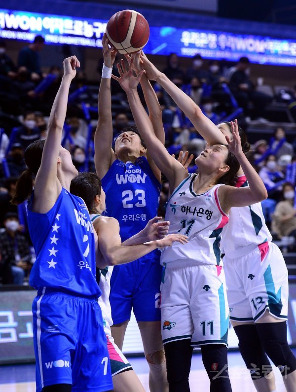 26일 충청남도 아산이순신체육관에서 열린 ‘신한은행 SOL 2022-2023 여자프로농구’ 아산 우리은행과 부천 하나원큐의 경기에서 우리은행 김단비가 하나원큐 선수들과 리바운드를 다투고 있다.