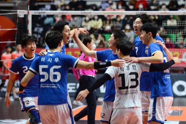 26일 안산 상록수체육관에서 열린 ‘2022~2023 도드람 V-리그’ 남자부 OK금융그룹과 현대캐피탈 경기에서 세트스코어 3-0 승리를 거둔 현대캐피탈 선수들이 기뻐하고 있다. 안산 | 김종원 기자 won@donga.com