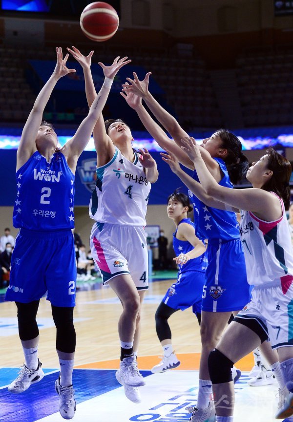26일 충청남도 아산이순신체육관에서 열린 ‘신한은행 SOL 2022-2023 여자프로농구’ 아산 우리은행과 부천 하나원큐의 경기에서 양 팀 선수들이 리바운드를 다투고 있다.