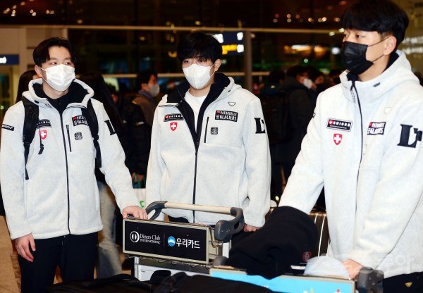 프로야구 SSG 랜더스가 30일 인천국제공항을 통해 스프링캠프 훈련지인 미국 플로리다로 출국했다. SSG 오원석이 동료들과 이야기를 나누고 있다.