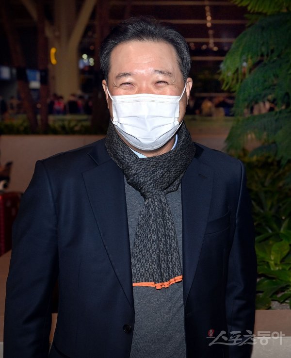 프로야구 삼성 라이온즈가 30일 인천국제공항을 통해 스프링캠프 훈련지인 일본 오키나와로 출국했다. 삼성 박진만 감독이 인터뷰를 앞두고 환한 미소를 짓고 있다.