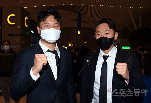 프로야구 삼성 라이온즈가 30일 인천국제공항을 통해 스프링캠프 훈련지인 일본 오키나와로 출국했다. 삼성 이병헌, 송준석이 포즈를 취하고 있다.