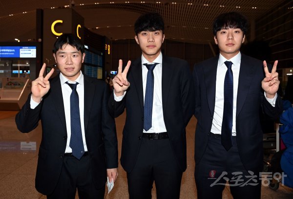 프로야구 삼성 라이온즈가 30일 인천국제공항을 통해 스프링캠프 훈련지인 일본 오키나와로 출국했다. 삼성 김지찬, 이재현, 김현준이 포즈를 취하고 있다.