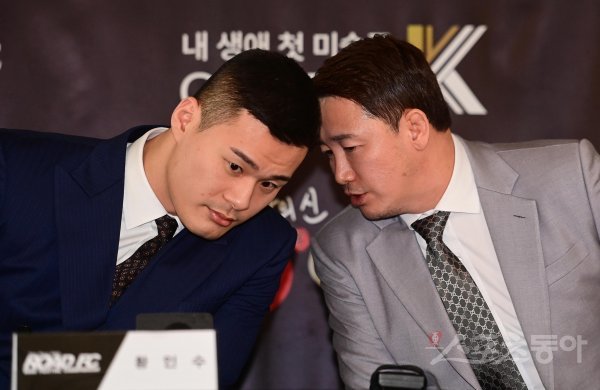황인수와 정문홍이 30일 서울 용산구 갤러리K서울타워점에서 열린 ‘황인수 vs 명현만 vs 권아솔’ 기자회견에서 이야기를 하고 있다.