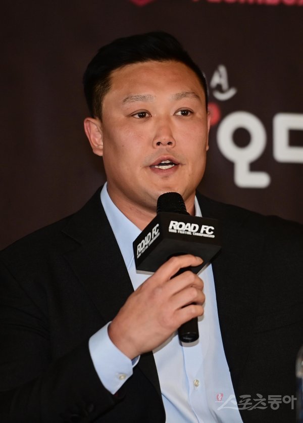 명현만이 30일 서울 용산구 갤러리K서울타워점에서 열린 ‘황인수 vs 명현만 vs 권아솔’ 기자회견에서 대회 출전 소감을 말하고 있다.