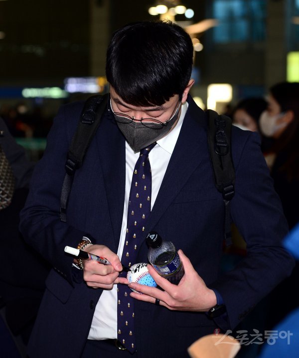 프로야구 KIA 타이거즈가 30일 인천국제공항을 통해 스프링캠프 훈련지인 미국 애리조나로 출국했다. KIA 양현종이 팬에게 사인을 하고 있다.