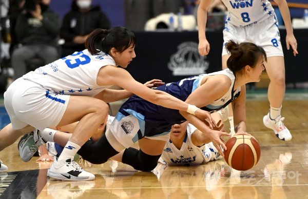 30일 인천도원체육관에서 열린 ‘신한은행 SOL 2022~2023 여자프로농구’ 신한은행과 우리은행 경기에서 우리은행 김단비와 신한은행 구슬이 루즈볼을 다투고 있다.
