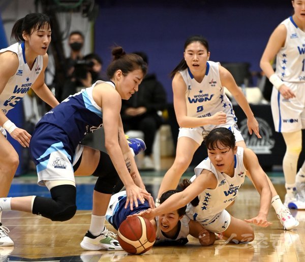 30일 인천도원체육관에서 열린 ‘신한은행 SOL 2022~2023 여자프로농구’ 신한은행과 우리은행 경기에서 우리은행 박지현과 신한은행 이경은, 구슬이 루즈볼을 다투고 있다.