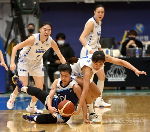 30일 인천도원체육관에서 열린 ‘신한은행 SOL 2022~2023 여자프로농구’ 신한은행과 우리은행 경기에서 우리은행 박지현과 신한은행 이경은이 루즈볼을 다투고 있다.