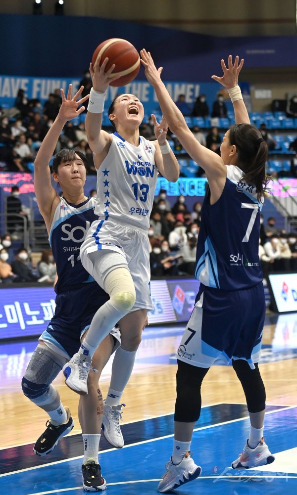 30일 인천도원체육관에서 열린 ‘신한은행 SOL 2022~2023 여자프로농구’ 신한은행과 우리은행 경기에서 우리은행 김정은이 신한은행의 수비를 뚫고 골밑 슛을 하고 있다.