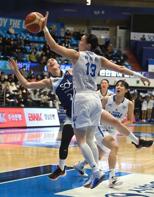 30일 인천도원체육관에서 열린 ‘신한은행 SOL 2022~2023 여자프로농구’ 신한은행과 우리은행 경기에서 신한은행 김소니아가 슛 동작에서 반칙을 얻어내고 있다.