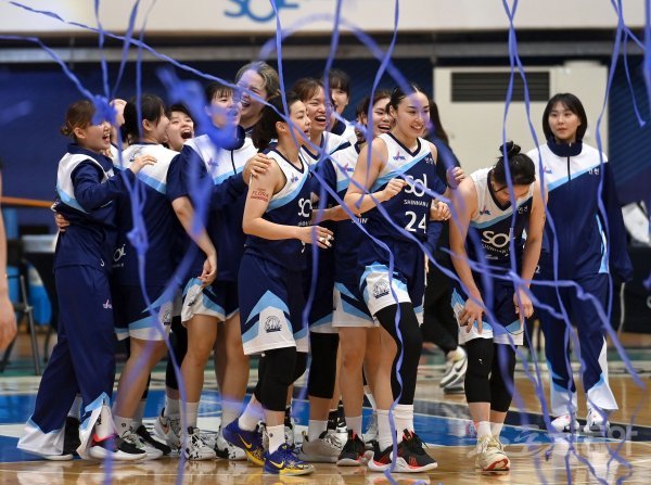 30일 인천도원체육관에서 열린 ‘신한은행 SOL 2022~2023 여자프로농구’ 신한은행과 우리은행 경기에서 74-72 승리를 거둔 신한은행 선수들이 환호하고 있다.