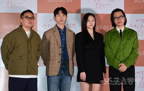 감독 형슬우, 배우 강길우, 정다은, 이동휘가 1일 서울 용산구 CGV용산아이파크몰점에서 열린 영화 ‘어쩌면 우린 헤어졌는지 모른다’ 언론시사회에서 포즈를 취하고 있다.