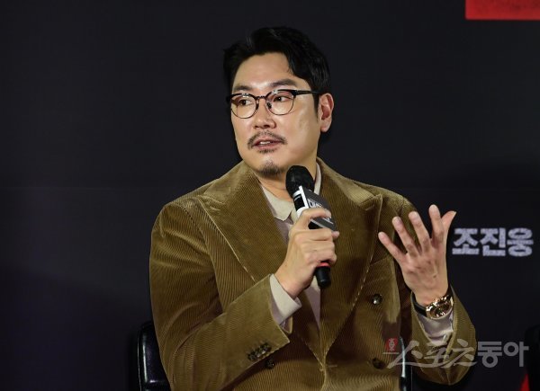 배우 조진웅이 2일 서울 성동구 성수동 메가박스 성수점에서 열린 영화 ‘대외비’ 제작보고회에서 MC의 질문에 답하고 있다.