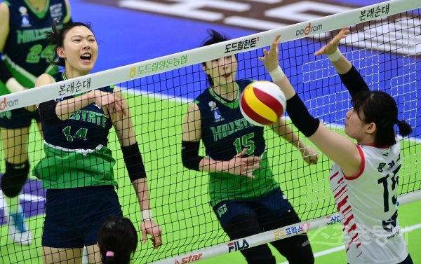 2일 수원실내체육관에서 열린 ‘2022-2023 도드람 V-리그’ 여자부 수원 현대건설과 서울 GS칼텍스의 경기에서 현대건설 양효진이 GS칼텍스 블로커 앞에서 스파이크를 하고 있다.