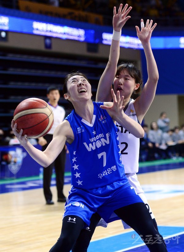 5일 충남 아산 이순신체육관에서 열린 ‘신한은행 SOL 2022-2023 여자프로농구’ 아산 우리은행과 청주 KB의 경기에서 우리은행 박혜진이 KB 양지수의 수비를 피해 슛을 시도하고 있다.