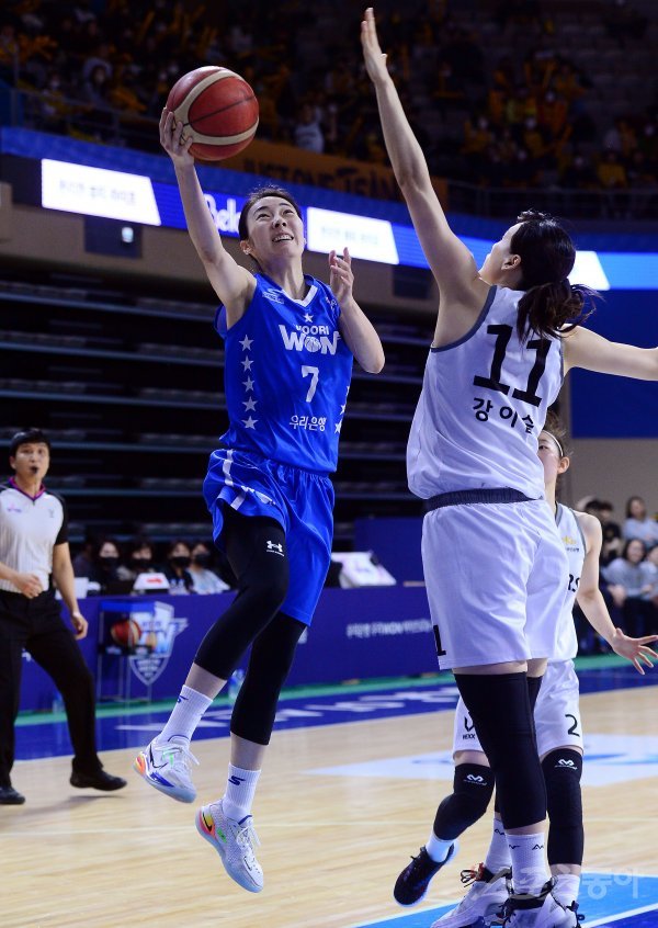 5일 충남 아산 이순신체육관에서 열린 ‘신한은행 SOL 2022-2023 여자프로농구’ 아산 우리은행과 청주 KB의 경기에서 우리은행 박혜진이 KB 수비를 피해 슛을 쏘고 있다.