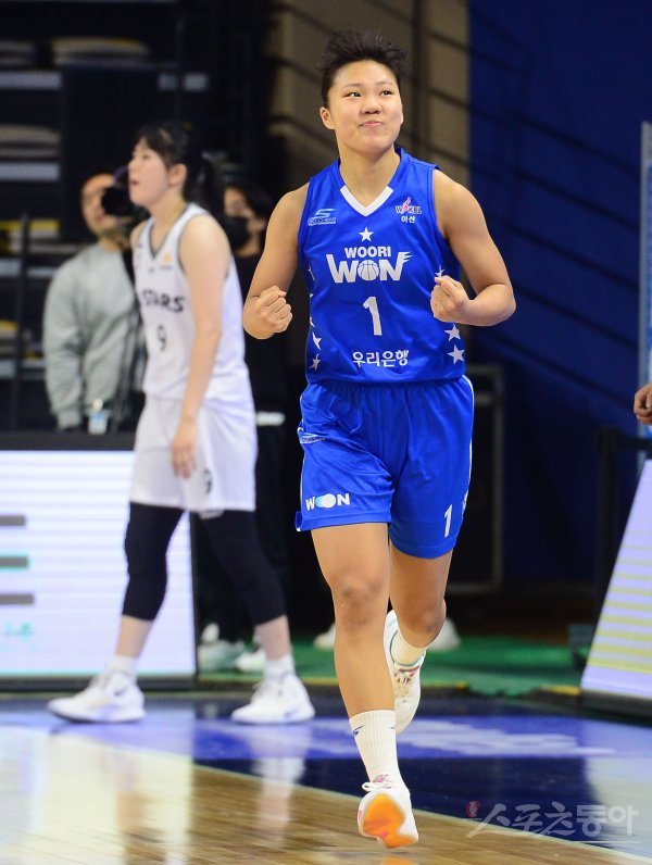 5일 충남 아산 이순신체육관에서 열린 ‘신한은행 SOL 2022-2023 여자프로농구’ 아산 우리은행과 청주 KB의 경기에서 우리은행 박지현이 3점슛을 성공한 후 주먹을 쥐며 환호하고 있다.