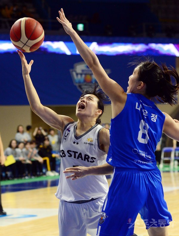 5일 충남 아산 이순신체육관에서 열린 ‘신한은행 SOL 2022-2023 여자프로농구’ 아산 우리은행과 청주 KB의 경기에서 KB 심성영이 우리은행 수비를 피해 슛을 쏘고 있다.