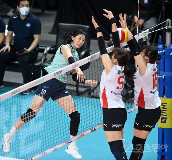 5일 서울 장충체육관에서 열린 ‘2022~2023 도드람 V-리그’ 여자부 GS칼텍스와 페퍼저축은행 경기에서 GS칼텍스 강소휘가 페퍼저축은행의 블로킹 사이로 스파이크를 날리고 있다.