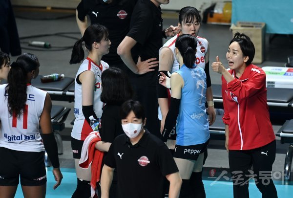 5일 서울 장충체육관에서 ‘2022~2023 도드람 V-리그’ 여자부 GS칼텍스와 페퍼저축은행 경기가 열렸다. 양팀 트레이드 과정에서 추가한 전 소속팀 GS칼텍스와 경기 출전 금지 조항으로 페퍼저축은행 오지영이 작전 타임 때 선수들을 격려하고 있다.
