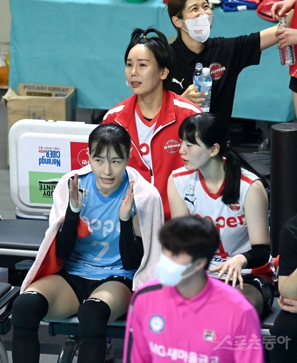 5일 서울 장충체육관에서 ‘2022~2023 도드람 V-리그’ 여자부 GS칼텍스와 페퍼저축은행 경기가 열렸다. 양팀 트레이드 과정에서 추가한 전 소속팀 GS칼텍스와 경기 출전 금지 조항으로 페퍼저축은행 오지영이 벤치에서 경기를 바라보고 있다.