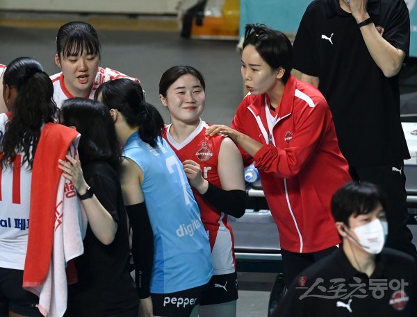 5일 서울 장충체육관에서 ‘2022~2023 도드람 V-리그’ 여자부 GS칼텍스와 페퍼저축은행 경기가 열렸다. 양팀 트레이드 과정에서 추가한 전 소속팀 GS칼텍스와 경기 출전 금지 조항으로 페퍼저축은행 오지영이 김해빈을 격려하고 있다.