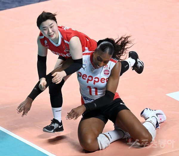 5일 서울 장충체육관에서 열린 ‘2022~2023 도드람 V-리그’ 여자부 GS칼텍스와 페퍼저축은행 경기에서 페퍼저축은행 김해빈과 니아 리드가 디그 과정에서 충돌하고 있다.
