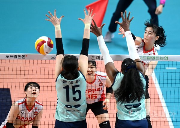 5일 서울 장충체육관에서 열린 ‘2022~2023 도드람 V-리그’ 여자부 GS칼텍스와 페퍼저축은행 경기에서 페퍼저축은행 박은서가 GS칼텍스의 블로킹 사이로 스파이크를 날리고 있다.