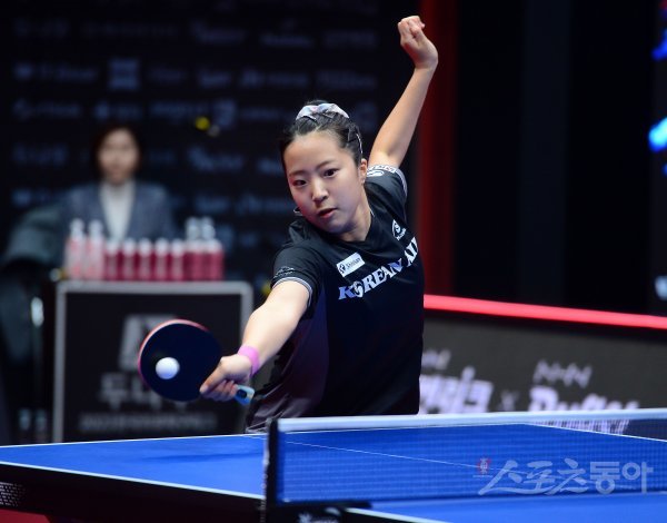 5일 경기도 수원시 경기대 광교체육관 탁구전용경기장(스튜디오T)에서 열린 ‘ 2023 두나무 KTTL 여자 코리아리그’ 대한항공과 포스코인터내셔널의 경기에서 대한항공 신유빈이 경기를 펼치고 있다.