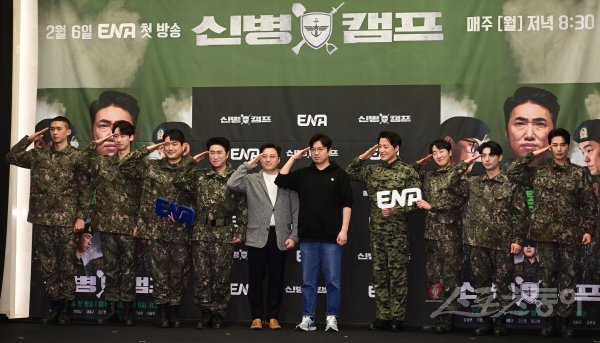 배우 전승훈, 이상진, 남태우, 코미디언 장동민, 민진기 감독, 문태주 CP, 방송인 최영재, 김현규, 차영남, 이충구가 6일 서울 마포구 상암동 스탠포드호텔 서울에서 열린 ENA 새 예능프로그램 ‘신병캠프’ 제작발표회에서 포즈를 취하고 있다.