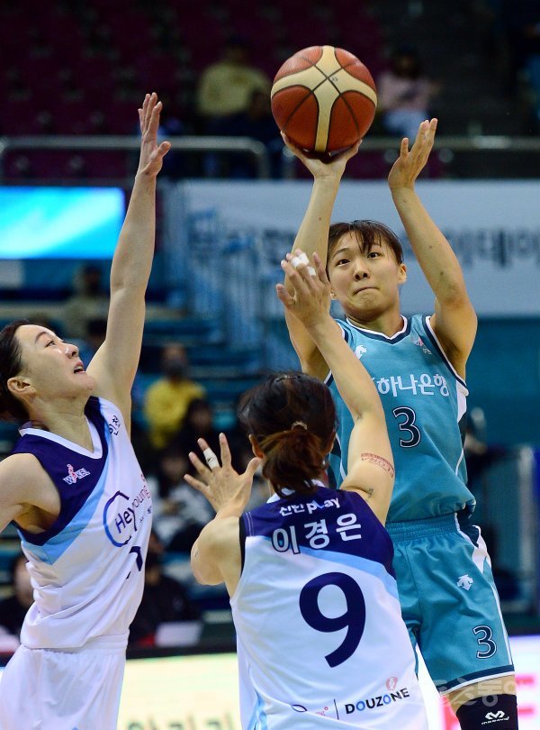 6일 경기도 부천실내체육관에서 열린 ‘신한은행 SOL 2022-2023 여자프로농구’ 부천 하나원큐와 인천 신한은행의 경기에서 하나원큐 정예림이 신한은행 수비를 피해 슛을 쏘고 있다.
