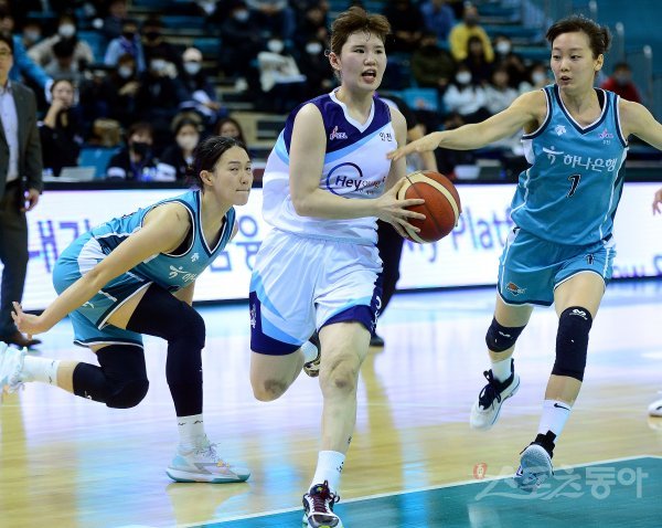 6일 경기도 부천실내체육관에서 열린 ‘신한은행 SOL 2022-2023 여자프로농구’ 부천 하나원큐와 인천 신한은행의 경기에서 신한은행 이혜미가 하나원큐 수비 사이로 돌파를 시도하고 있다.
