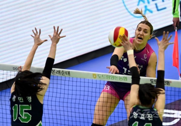 7일 경기도 수원실내체육관에서 ‘2022-2023 도드람 V리그’ 수원 현대건설과 인천 흥국생명의 여자부 경기가 열렸다. 흥국생명 옐레나가 현대건설 블로커를 피해 스파이크를 날리고 있다.