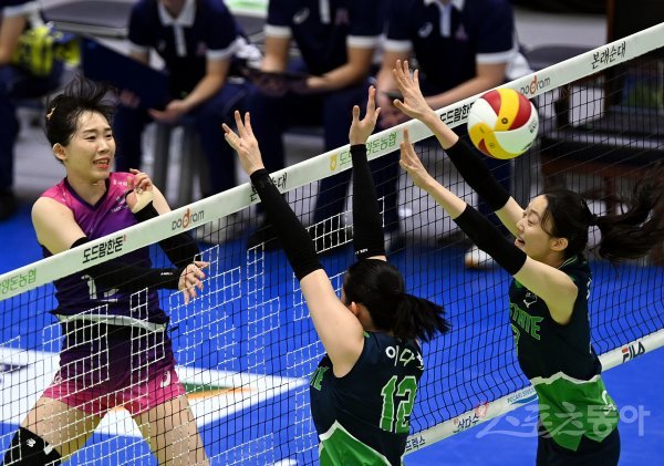 7일 경기도 수원실내체육관에서 ‘2022-2023 도드람 V리그’ 수원 현대건설과 인천 흥국생명의 여자부 경기가 열렸다. 흥국생명 김미연이 현대건설 블로커를 피해 스파이크를 날리고 있다.