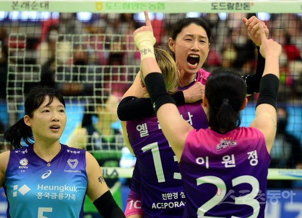 7일 경기도 수원실내체육관에서 ‘2022-2023 도드람 V리그’ 수원 현대건설과 인천 흥국생명의 여자부 경기가 열렸다. 흥국생명 김연경이 득점을 올린 후 환호하고 있다.
