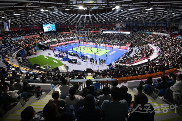 7일 경기도 수원실내체육관에서 ‘2022-2023 도드람 V리그’ 수원 현대건설과 인천 흥국생명의 여자부 경기가 열렸다. 1, 2위 맞대결을 맞아 만원관중이 들어차 경기를 즐기고 있다.