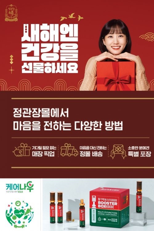 KGC인삼공사가 온라인 유통 채널 강화 및 디지털 헬스케어 사업 진출 등 온라인과 디지털 강화를 통해 다채로운 고객 경험을 제공하고 있다. 모델 박은빈이 소개하는 정관장몰 새해 이벤트, 카카오톡 선물하기 전용으로 내놓은 ‘활기력 부스터 박스’, ‘케어나우 3,0’ 로고(위부터 시계방향). 사진제공 | KGC인삼공사