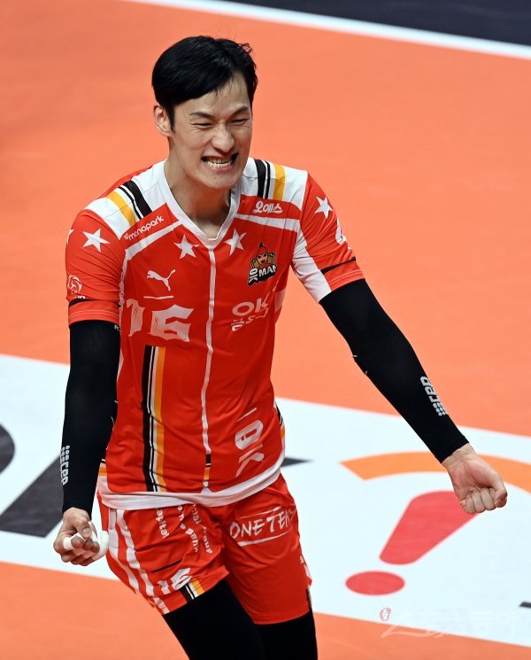 8일 경기도 안산 상록수체육관에서 ‘2022-2023 도드람 V리그’ 안산 OK금융그룹과 서울 우리카드의 남자부 경기가 열렸다. OK금융그룹 진상헌이 가로막기를 성공한 후 환호하고 있다.
