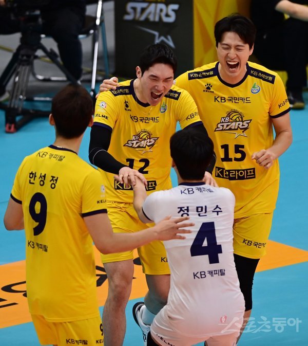 9일 경기도 의정부체육관에서 열린 ‘2022-2023 도드람 V-리그’ 남자부 의정부 KB손해보험과 수원 한국전력의 경기에서 블로킹 득점에 성공한 황경민이 동료들과 기쁨을 나누고 있다.